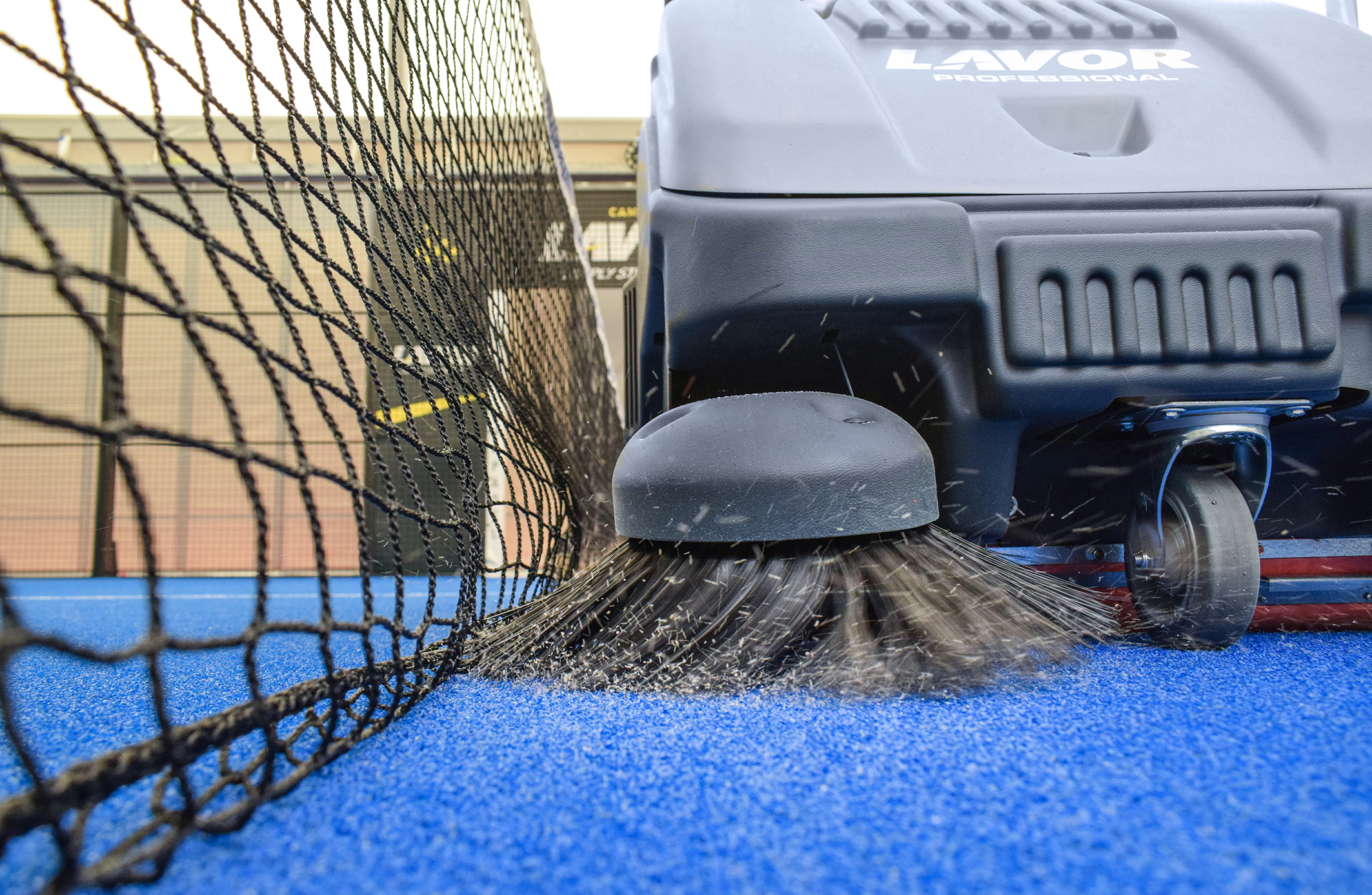 Unlike standard industrial sweepers, this walk-behind electric model is designed to handle the fine silica sand (infill) that is essential for proper ball bounce and player traction. Its primary function is to efficiently clear debris like leaves, fluff from balls, and dust, while simultaneously grooming the turf to ensure the sand remains evenly distributed rather than compacted.